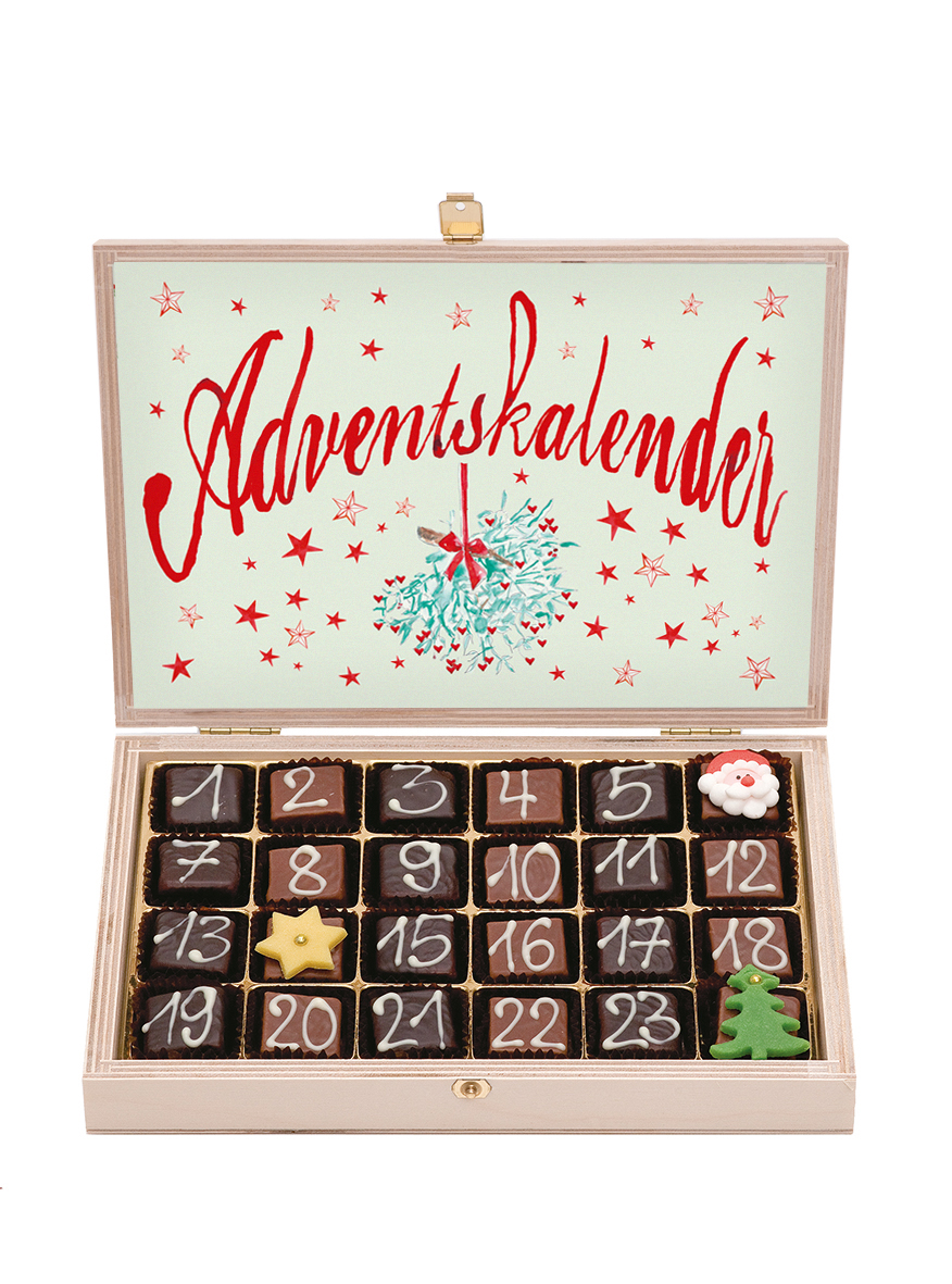 24 hochfeine handgefertigte Nuss-Nougat-Pralinen mit dreierlei Kuvertüre überzogen und von Hand beschriftet ca. 250 g