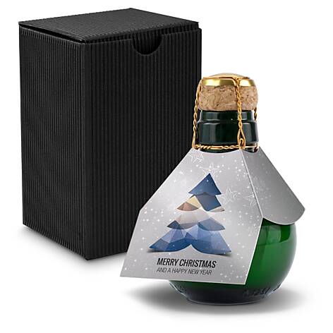 Eine kleinere gibt es nicht, 0,125 l Sekt brut. In einer grünen Flasche mit Naturkork, Verdrahtung und Manschette, verpackt in einer passenden Schmuckwelle.