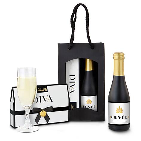 8 DIVA Trüffelkreationen von Lindt (114 g), perfekt kombiniert mit einer eleganten schwarz-matten Piccolo-Flasche mit abgestimmter Ausstattung