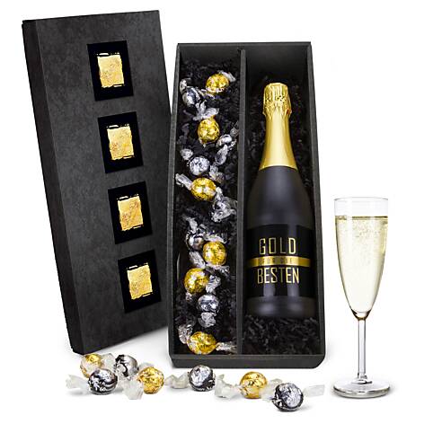 Hochwertiger Sekt in einer matt-schwarzer Flasche (Villa Römer Cuvèe 0,75 l) kombiniert mit 6 goldenen und 6 schwarzen Lindt Lindor-Kugeln (ca. 150 g)