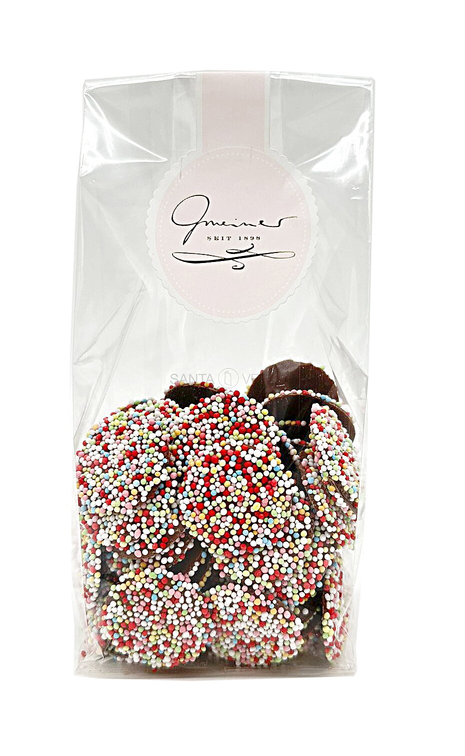 Feine Vollmilchschokolade (mit mind. 40% Kakao) mit bunten Zuckerperlen bestreut.